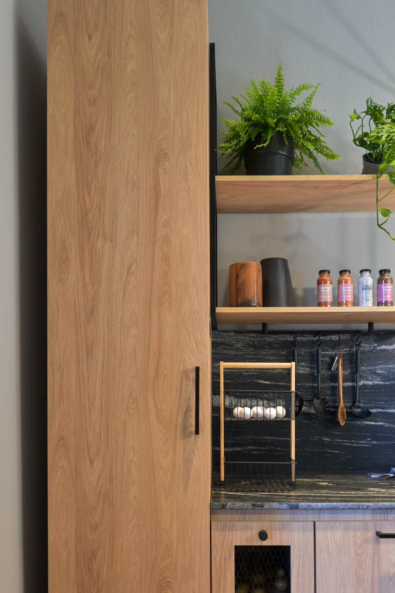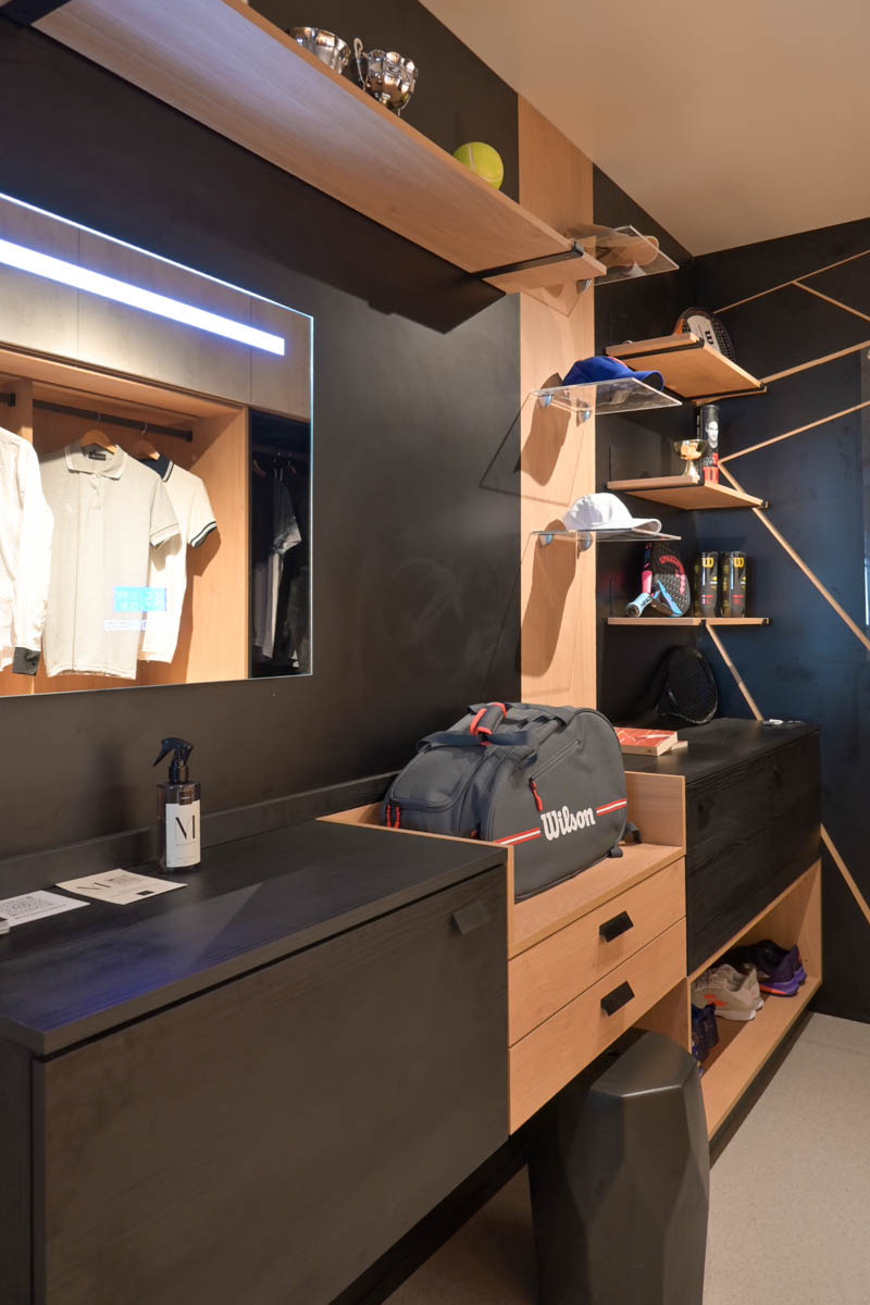 El equipo de Cubes, con su espacio Vestidor para un deportista, eligió la combinación Roble Kendal encerado y Negro con textura para el sector de ropa y objetos deportivos, y la misma madera combinada con la reproducción de material Hormigón Chicago gris oscuro para la ropa del día a día; logrando así diferenciar el espacio según su uso.
