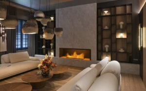 El Espacio Refugio de CZ Estudio propuso un lugar de encuentro para compartir y disfrutar de la lectura. Para ello eligieron los diseños Nogal del Pacífico natural y Negro con textura madera para revestir las paredes y para la biblioteca que enmarca la pared del hogar.
