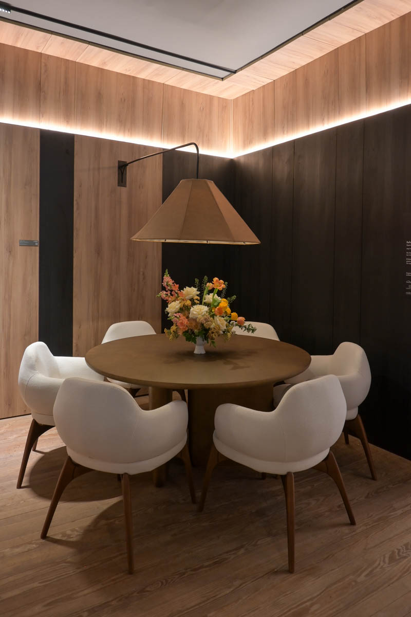 Las maderas en tonos medios y de apariencia cálida y natural fueron elegidas para diferentes propuestas, como el dormitorio El Refugio, a cargo de Casa Meva Estudio, la cocina de Julieta Primerano y las diferentes estaciones del espacio Four Seasons de A.P. Estudio quienes eligieron los diseños Nogal del Pacífico natural, Hickory natural y Coco Bolo respectivamente.