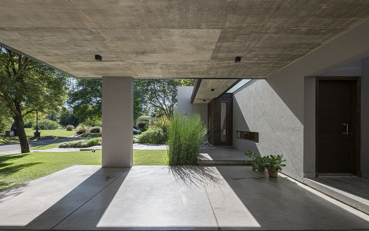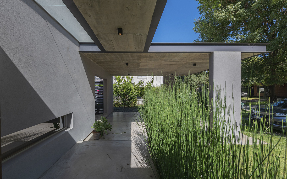 El partido arquitectónico delimita dos zonas bien diferenciadas desde el ingreso hasta la zona de dormitorios, con una gradación natural entre lo social y lo privado. Sobre el lado menor del terreno se ubicaron los accesos a la vivienda: el peatonal, el de servicio y el vehicular, que culmina en una cochera abierta que forma parte fundamental de la fachada.