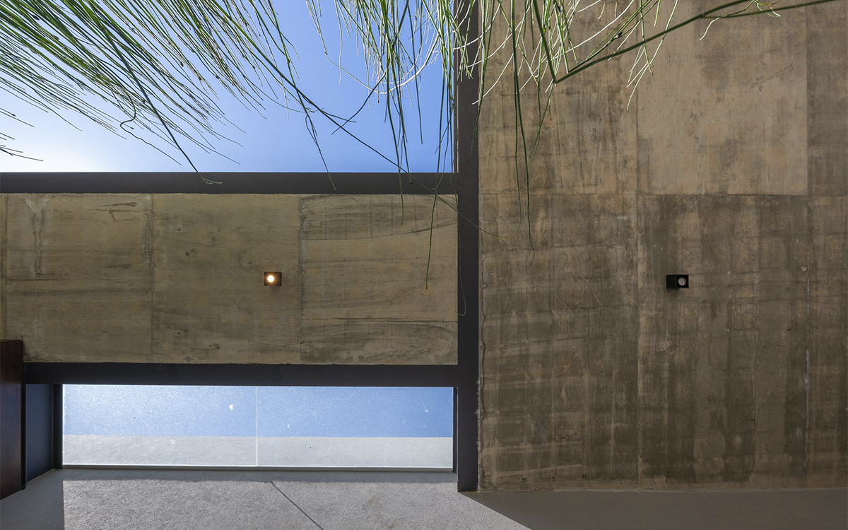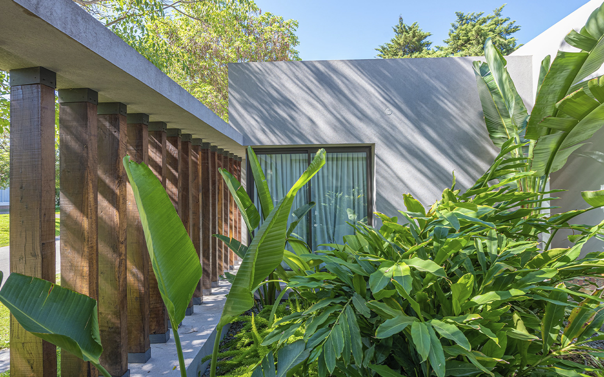 Pasando el estar comedor, a través de un pasillo de distribución nos conectamos con el sector íntimo recostado sobre la calle lateral con orientación este, separado del cuerpo principal de la vivienda por un patio lateral donde la vegetación actúa como filtro natural para la aislación de las actividades de descanso o reposo. El área está compuesta por dos dormitorios con baños en suite y vestidor, donde el principal, además, se abre al patio central a través de una pequeña galería pergolada.