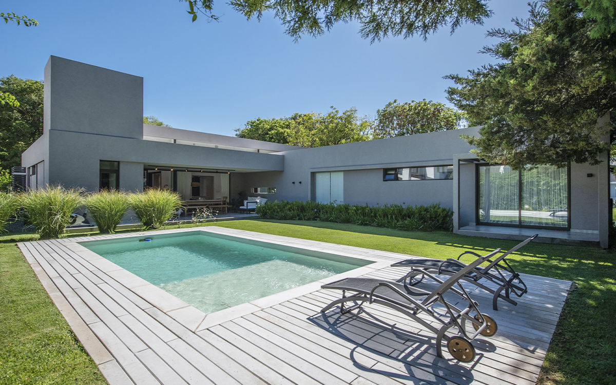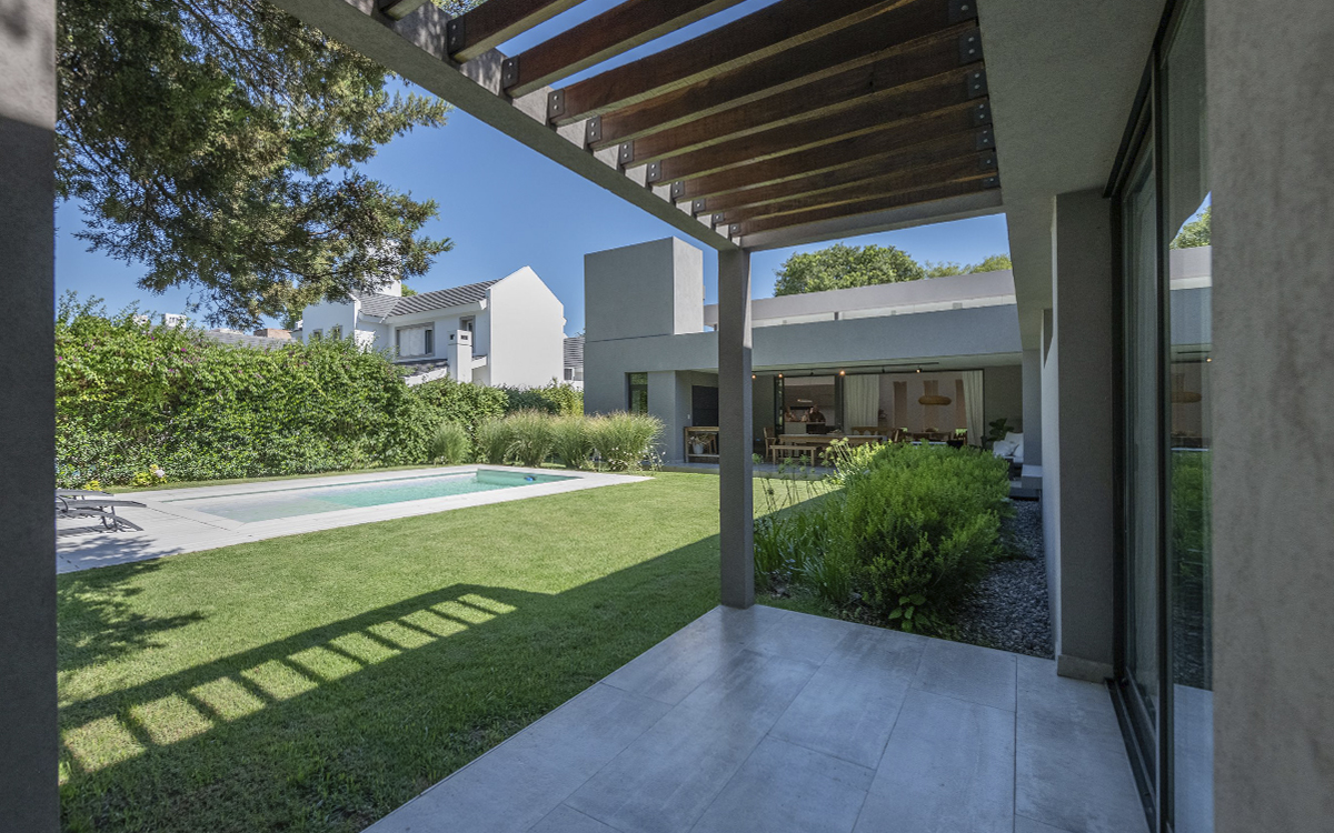 El patio principal contiene la pileta de natación y una zona de estar en el fondo del terreno, entre la vegetación existente, que actúa como telón de fondo y contenedor del gran espacio abierto.