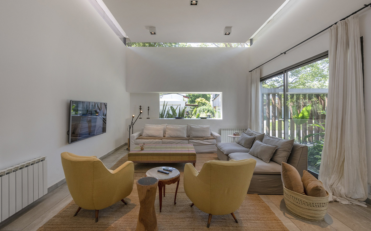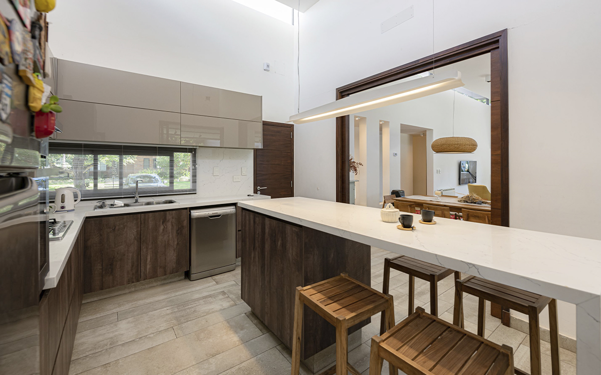 Atravesando el hall accedemos al espacio protagonista de la vivienda, el living comedor, que sobresale de la volumetría general y se destaca tanto por sus dimensiones en planta como por su altura e iluminación cenital, que se consigue al despegar el techo de las paredes en todo su perímetro, convirtiéndolo en un ambiente muy luminoso durante la mayor parte del día. Este gran volumen contiene a su vez a la cocina, que a través de una doble puerta corrediza se puede vincular espacialmente logrando, si es necesario, la integración funcional.