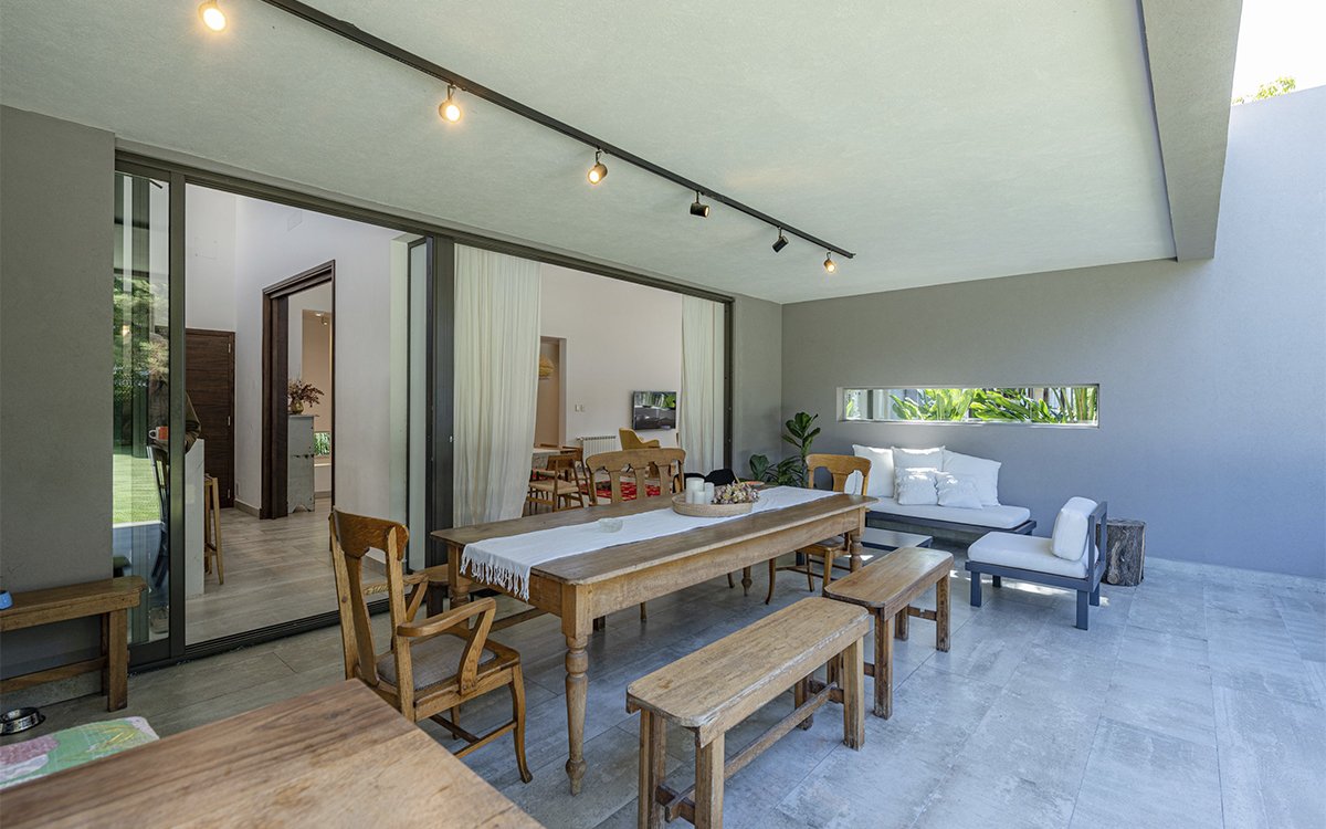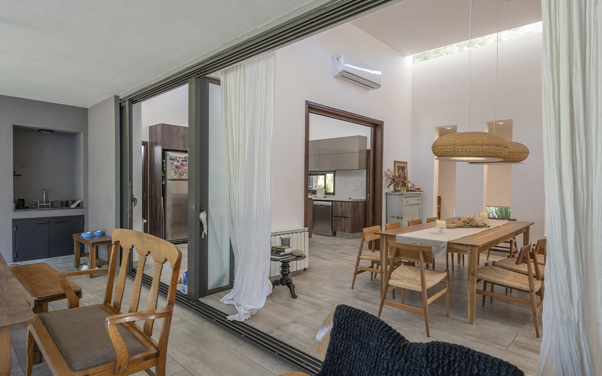 El estar-comedor y la cocina se expanden al patio principal a través de una galería con asador compartida, que puede vincularse funcionalmente a los espacios interiores al deslizar las tres hojas de una gran puerta ventana corrediza que se ocultan dentro de una pared de cerramiento lateral.