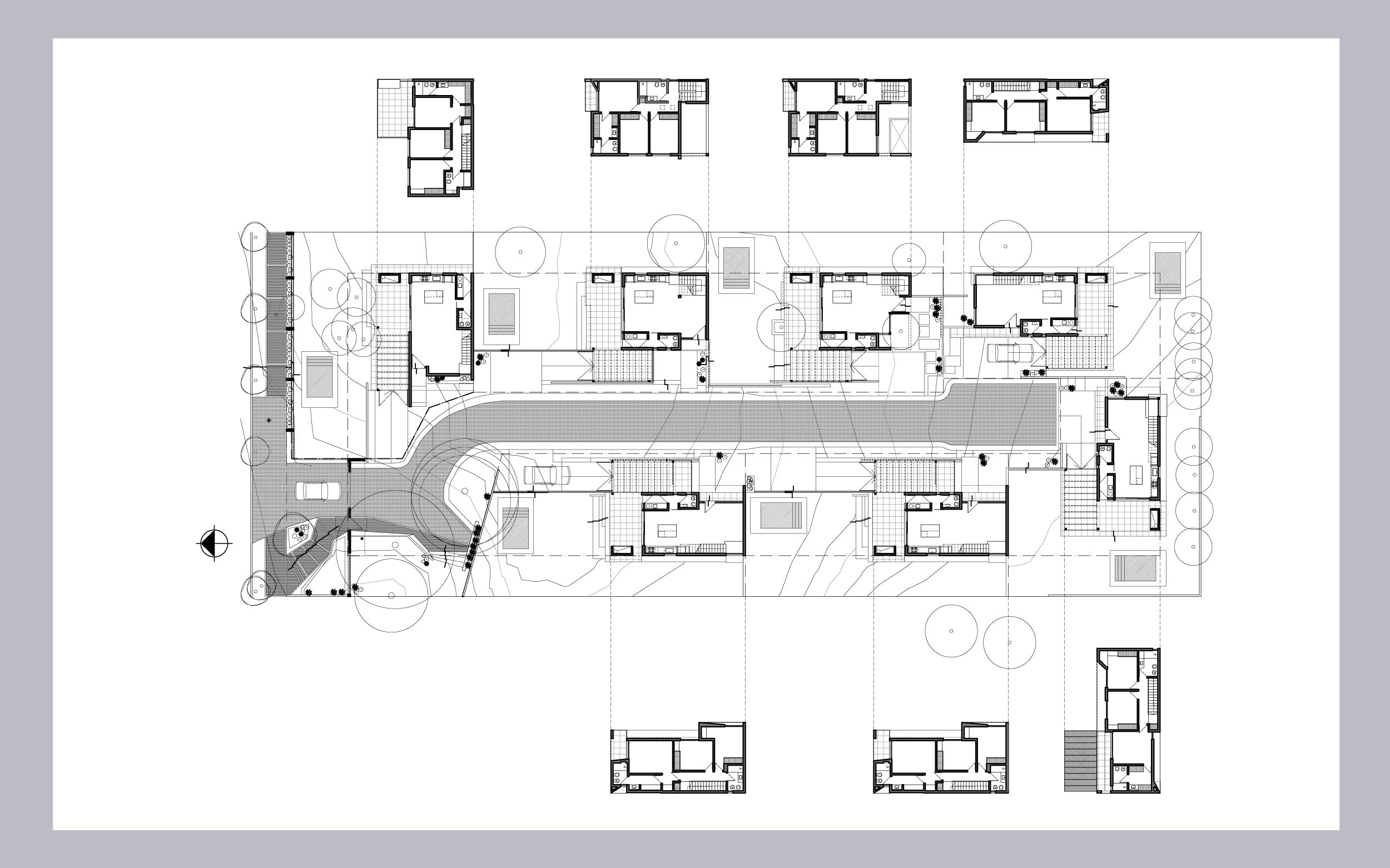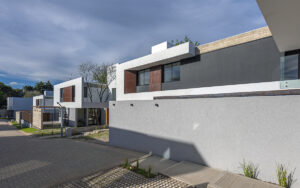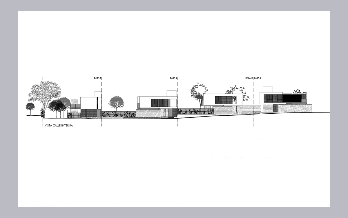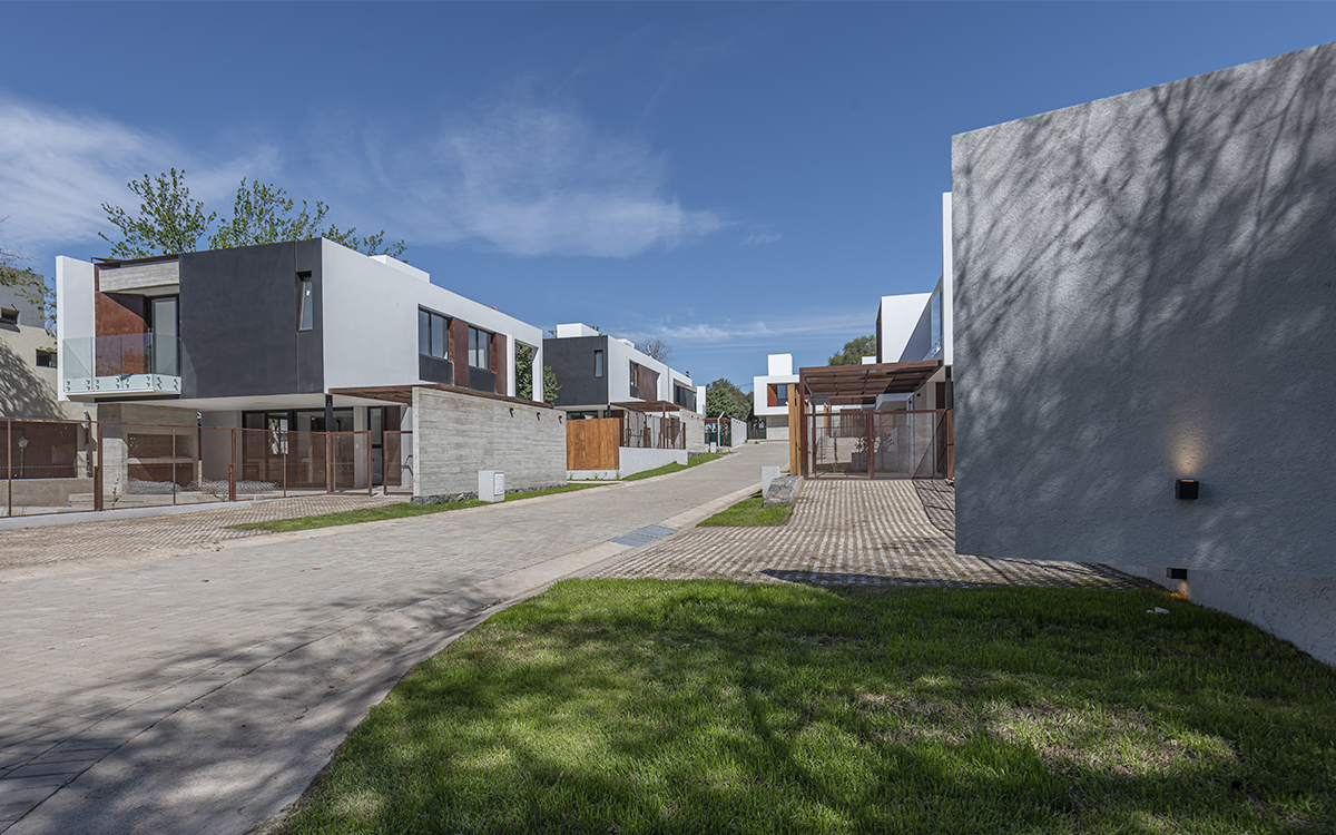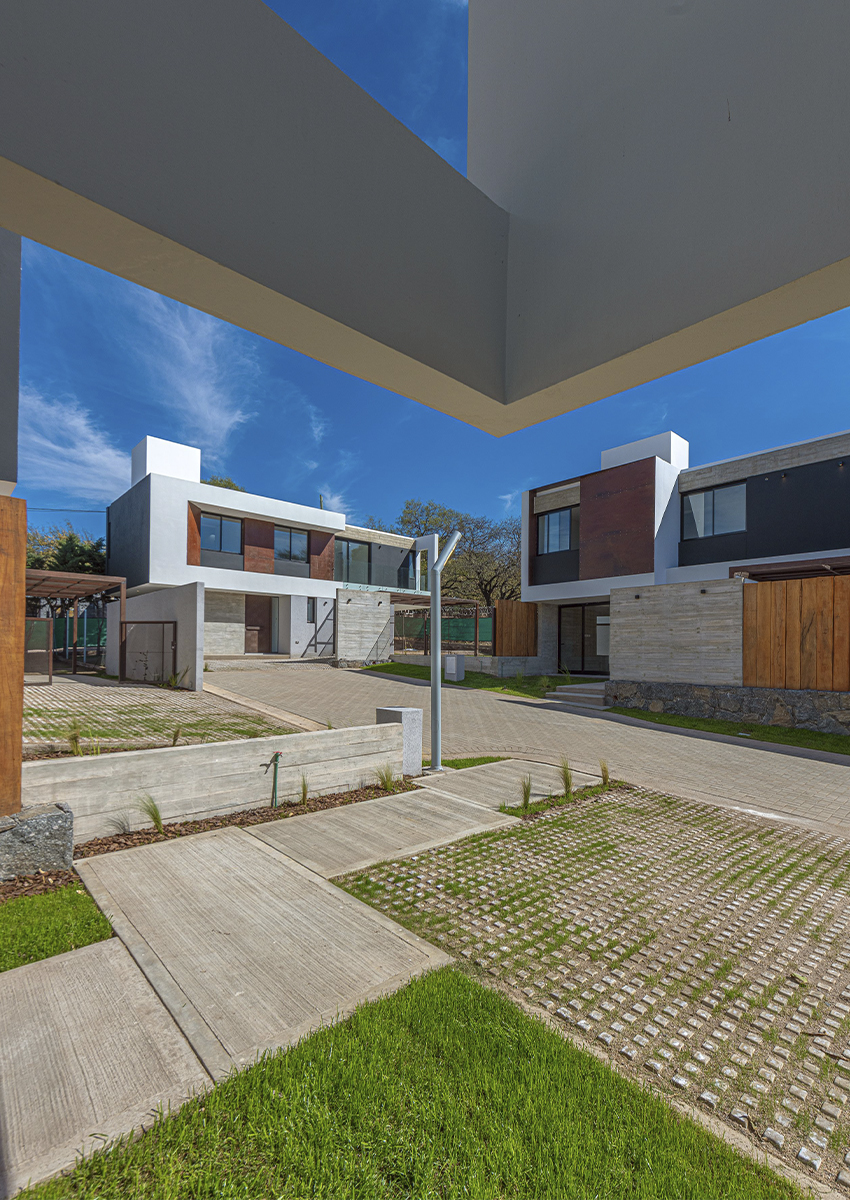 Se tuvo en cuenta esa topografía irregular del terreno para enfatizarla, no intentar negarla, sino utilizar los elementos necesarios como muros de contención en hormigón visto y en piedra, como así también el estudio de la implantación de cada casa en particular y su adaptación no sólo a la forma del lote, sino también a estos elementos naturales propios del sitio. No obstante, teniendo en cuenta las necesidades tipológicas actuales, de ambientes sociales únicos e integrados, las casas no tienen desniveles en su interior, sino que los desniveles se resuelven en las transiciones entre el exterior y el interior, entre los espacios comunes y los espacios privados, en las galerías o en los ingresos, en el pórtico de ingreso al complejo y en su entorno natural inmediato.