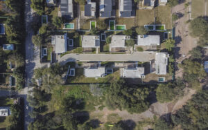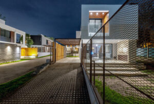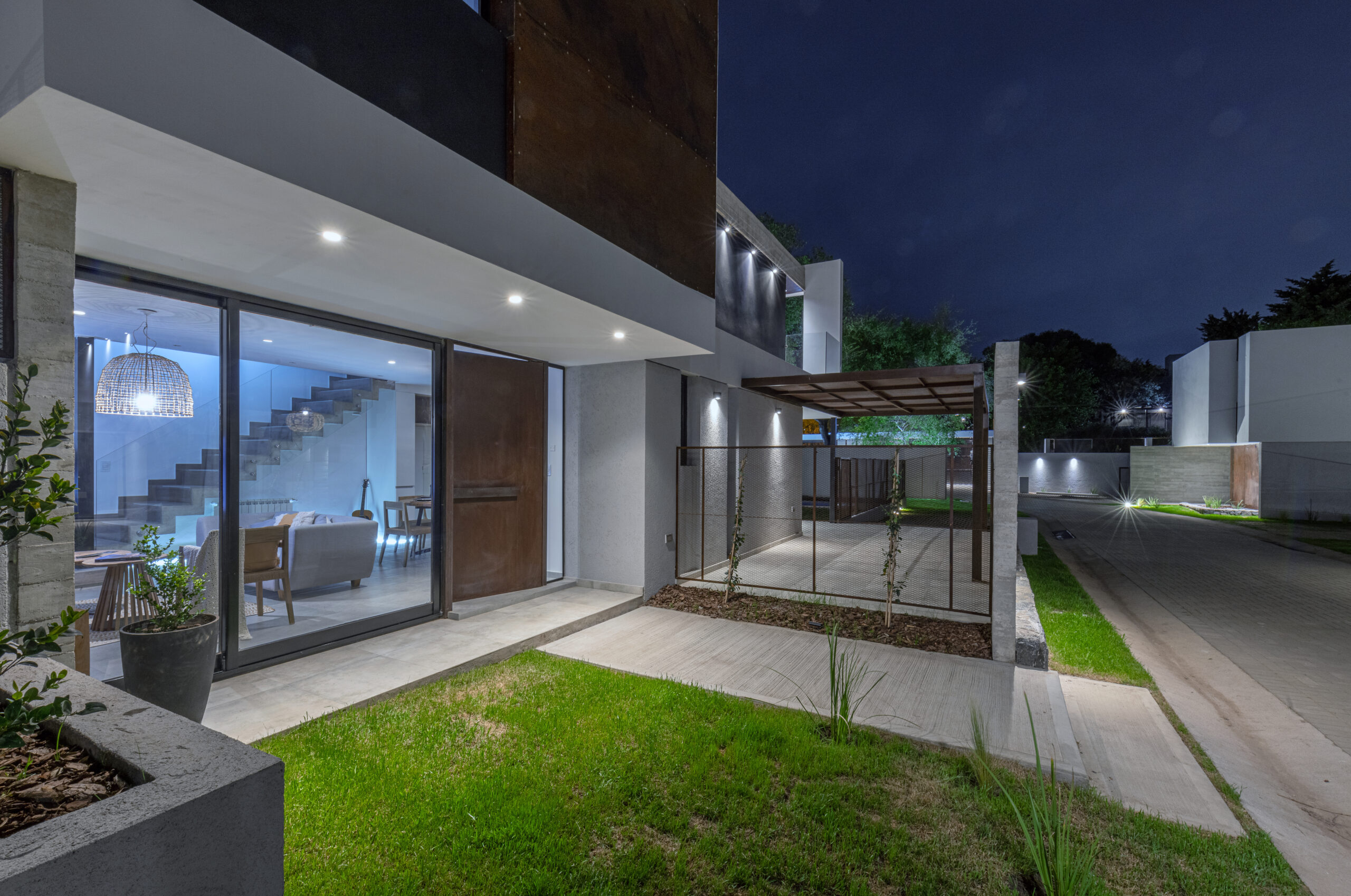 Se define la escala del proyecto entonces como un Housing de Casas, cuya cantidad según la ordenanza es de 7 unidades, con tipologías de aprox. 145m2 cubiertos y 15m2 de pérgola, exentas, de dos plantas, con patio y piscina individual. Sumado a eso, espacios exteriores comunes amplios, tanto dentro del conjunto como en sus accesos y fachada hacia el exterior, una plaza común con muy rica vegetación y un ingreso común único, seguro y jerarquizado.