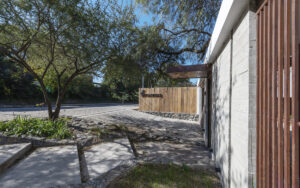 Si bien el pórtico de ingreso común existe no sólo por las necesidades de jerarquizarlo y darle identidad al complejo, sino también por la importancia de darle seguridad a su interior, la intención fue que la riqueza paisajística y arquitectónica se sintiera no sólo hacia adentro sino también hacia afuera, que fuera agradable recorrer esa vereda, ver las copas de los árboles añejos a través del pórtico o por encima del mismo, antes de ingresar o simplemente al caminar esa cuadra, sumarle elementos paisajísticos como plantas de pequeño y de mediano porte como agapantus y fotiñas entre otras, canteros materializados en piedra, durmientes de quebracho, etc, y fundamentalmente iluminados por la noche enfatizando a cada uno con sus cualidades, la importancia de la vegetación en sus diferentes escalas y el emplazamiento de la arquitectura con el diseño, la forma y la combinación de los materiales.