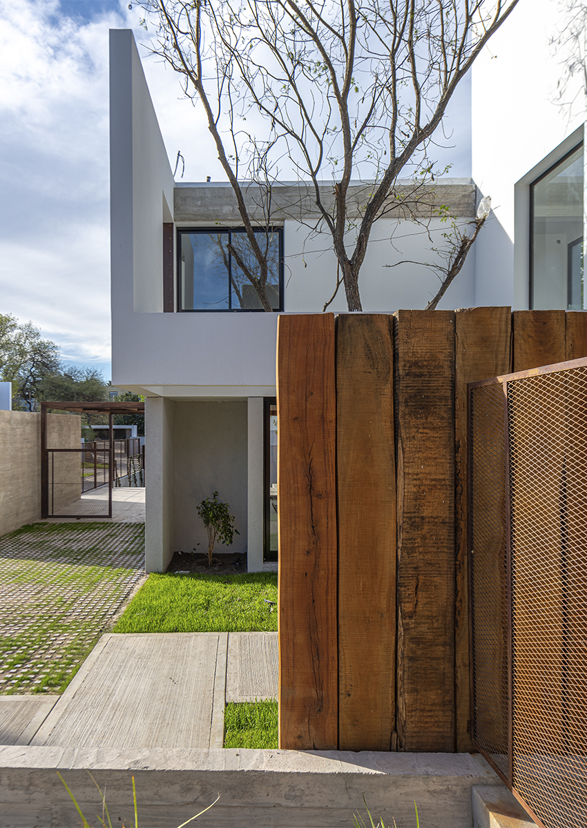 De lo natural del verde existente, de árboles y de césped en pendiente con la depresión del terreno transversal a todo el ancho del mismo, que genera la acción de bajar y volver a subir, se erigen muros de piedra tipo pirca y hormigón visto que hacen las veces de basamento y de contención. Luego, en la planta baja tenemos la continuidad del hormigón visto de las bases en tabiques hechos con encofrado de tablas de madera de pino para darle rusticidad. Y aprovechando sus cualidades de calidez y textura aparecen colocados en vertical durmientes de quebracho blanco, materializando cerramientos laterales como detalles dentro de un recorrido extenso de la calle interna para romper la monotonía. Por detrás y por arriba comienzan a aparecer los elementos de chapa oxidada, tanto en aberturas como en revestimiento de muros y en rejas del cerramiento de los patios. Así, el color del óxido dialoga con el verde. Por ejemplo, en las rejas de metal desplegado preparadas para que el jazmín crezca y se desarrolle trepando como cerco verde; y en la planta alta se suma a los revestimientos de chapa los muros en color negro, para dialogar con las copas de los árboles de mediano y de gran porte. Entre todos esos elementos resaltan los revoques finos blancos. La intención fue equilibrar un poco lo natural con lo construido, siendo que todos los elementos de la construcción por volumen iban a ser dominantes, al tener algunos elementos en chapa y en color negro, éstos hacen que el color blanco no sea tan excesivo y a la vez se consideró que tanto la chapa como el negro actúen bien de fondo para realzar el verde de lo natural.