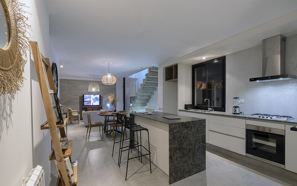 La parte dura que se repite en las 7 casas prácticamente sin alteraciones , es un núcleo conformado por la cocina con isla, el lavadero separado, el toilette, la cochera y la galería. Como así también la escalera, pero en este caso hay cinco iguales por ser las tipologías más rectangulares y otras dos iguales entre sí por ser las tipologías más cuadradas.