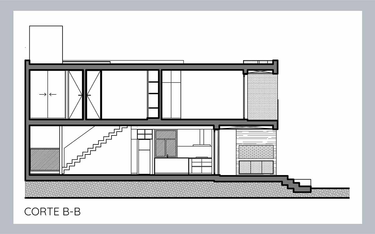 La parte blanda es la que termina de conformar el ambiente integrado de la planta baja, es decir el hall, el estar y el comedor. Este sistema es el que se modifica levemente para lograr tal diferenciación entre las distintas unidades. La planta alta acompaña por un lado esas pequeñas modificaciones, y por otro lado busca las mejores orientaciones posibles para las aberturas y los balcones o terrazas.